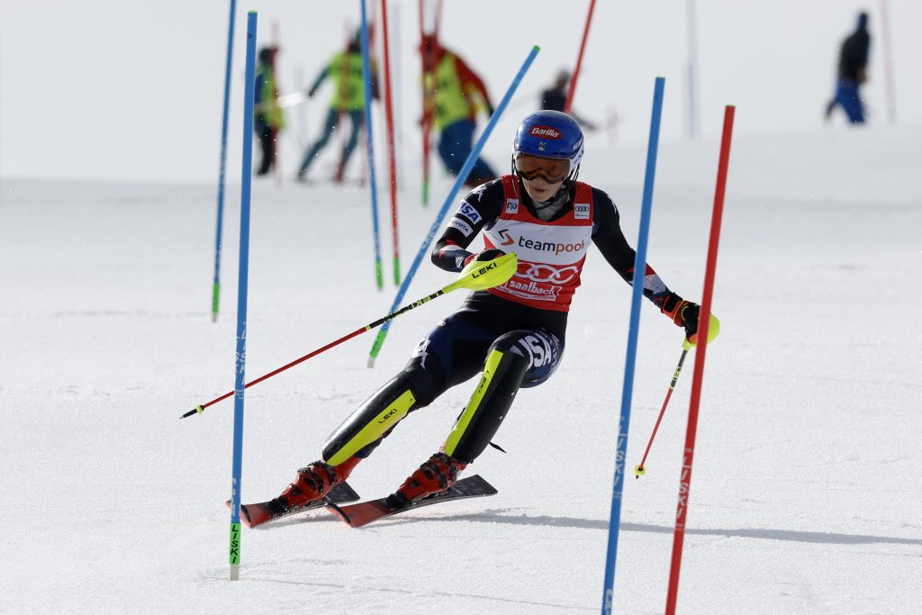 Mikaela Shiffrin competes within the first run of the Women’s World Cup slalom race in Saalbach, Austria on Saturday.