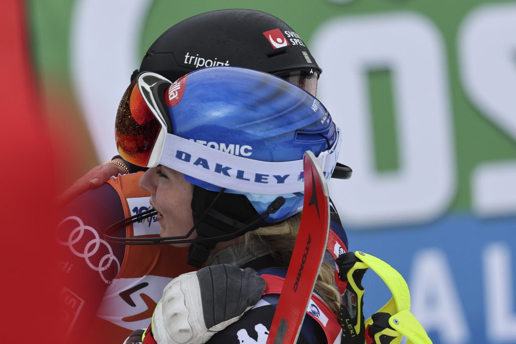 Mikaela Shiffrin (foreground) of the United States, who received the Women’s Alpine Ski World Cup slalom race, and runner-up Swedish skier Anna Swen Larsson embrace in Saalbach, Austria, Saturday, March 16, 2024. (AP Photo/Marco Trovati)